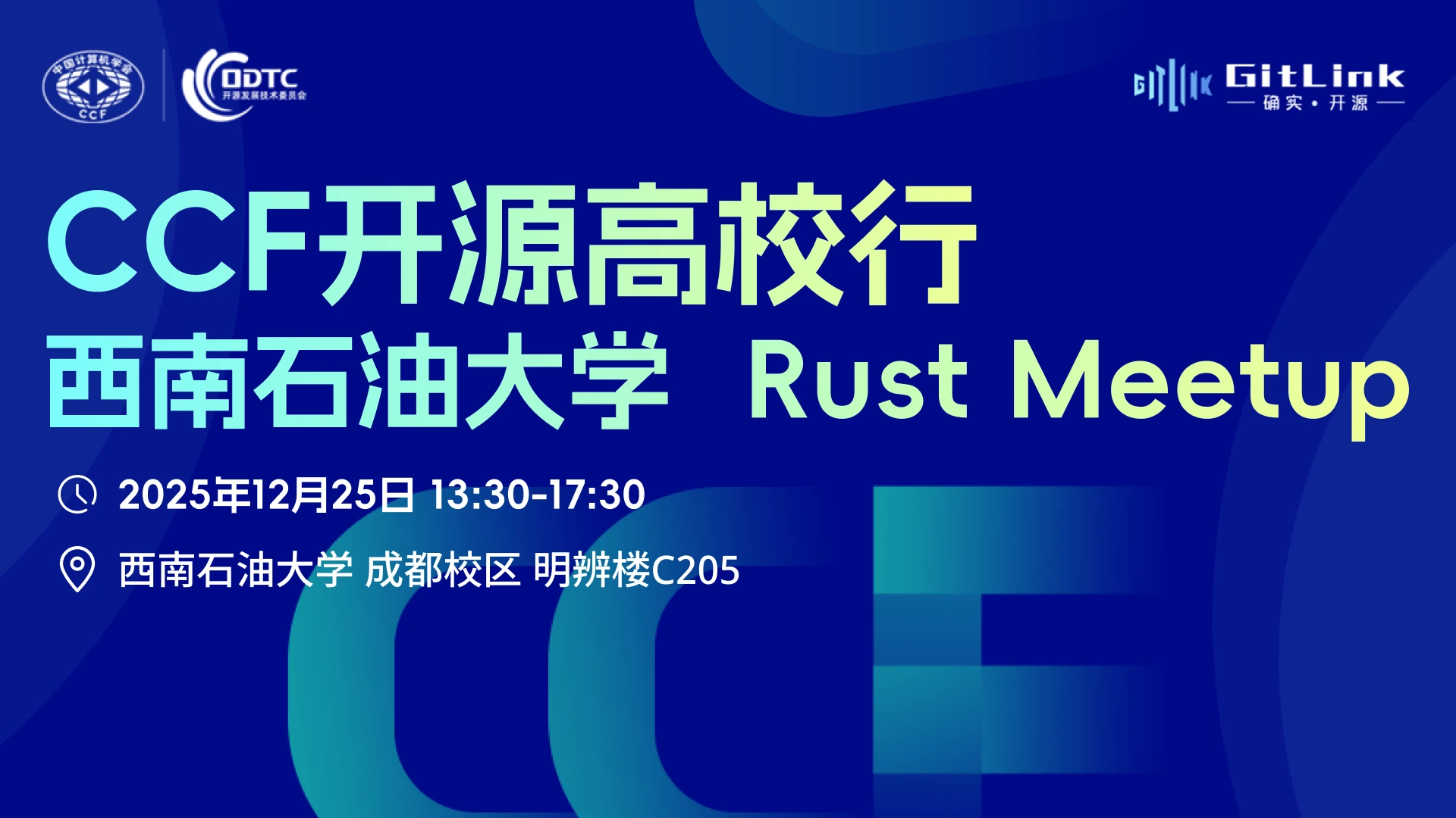 2025 年 12 月 25 日,“CCF 开源高校行”活动将走进西南石油大学,进行一场专注于 Rust 编程语言的技术 Meetup。本次活动由中国计算机学会(CCF)主办,开放原子旋武开源社区、西南石油大学、南京大学支持,汇聚来自蚂蚁集团、华为、北京科技大学、南京大学等企业和高校的 Rust 技术专家和研究者,为开发者们带来一场内容丰富、实践性强的技术盛宴。