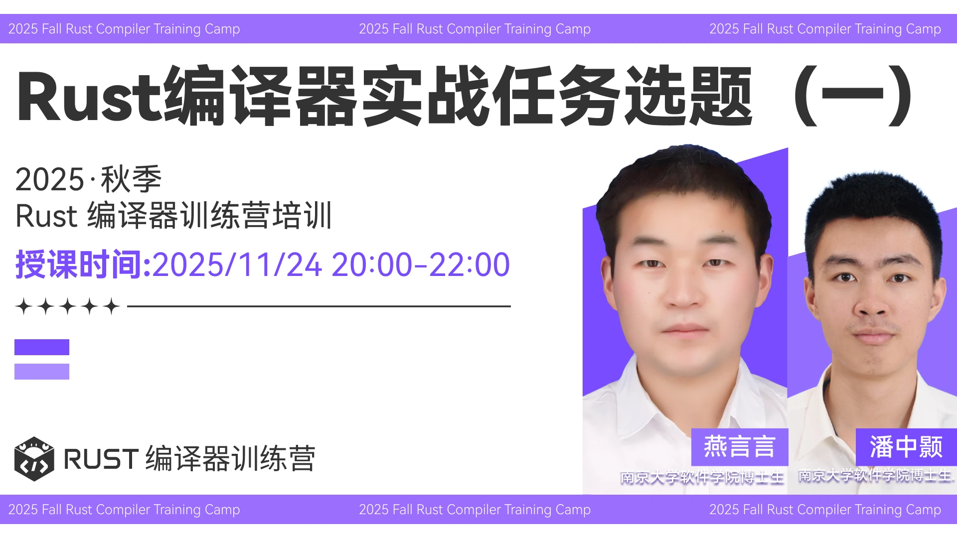 本次课程为 2025 秋季 Rust 编译器训练营第四阶段“Rust 编译器实战任务”第一次直播。由 南京大学软件学院博士生燕言言、潘中颢授课,欢迎参加!