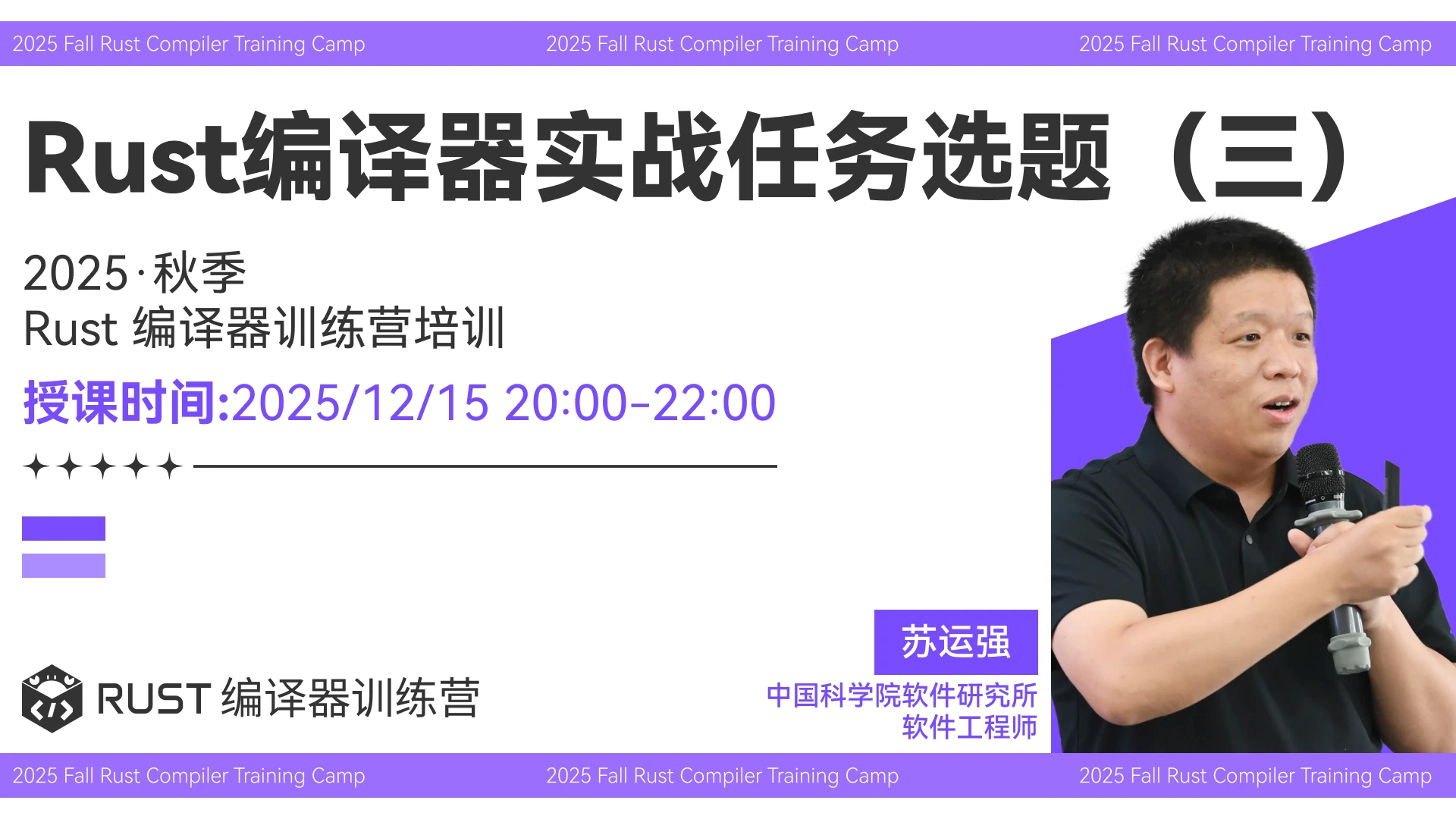本次课程为 2025 秋季 Rust 编译器训练营第四阶段“Rust 编译器实战任务”第三次直播。由中国科学院软件研究所软件工程师苏运强授课,欢迎参加!